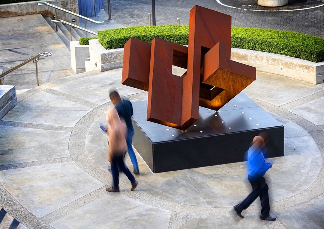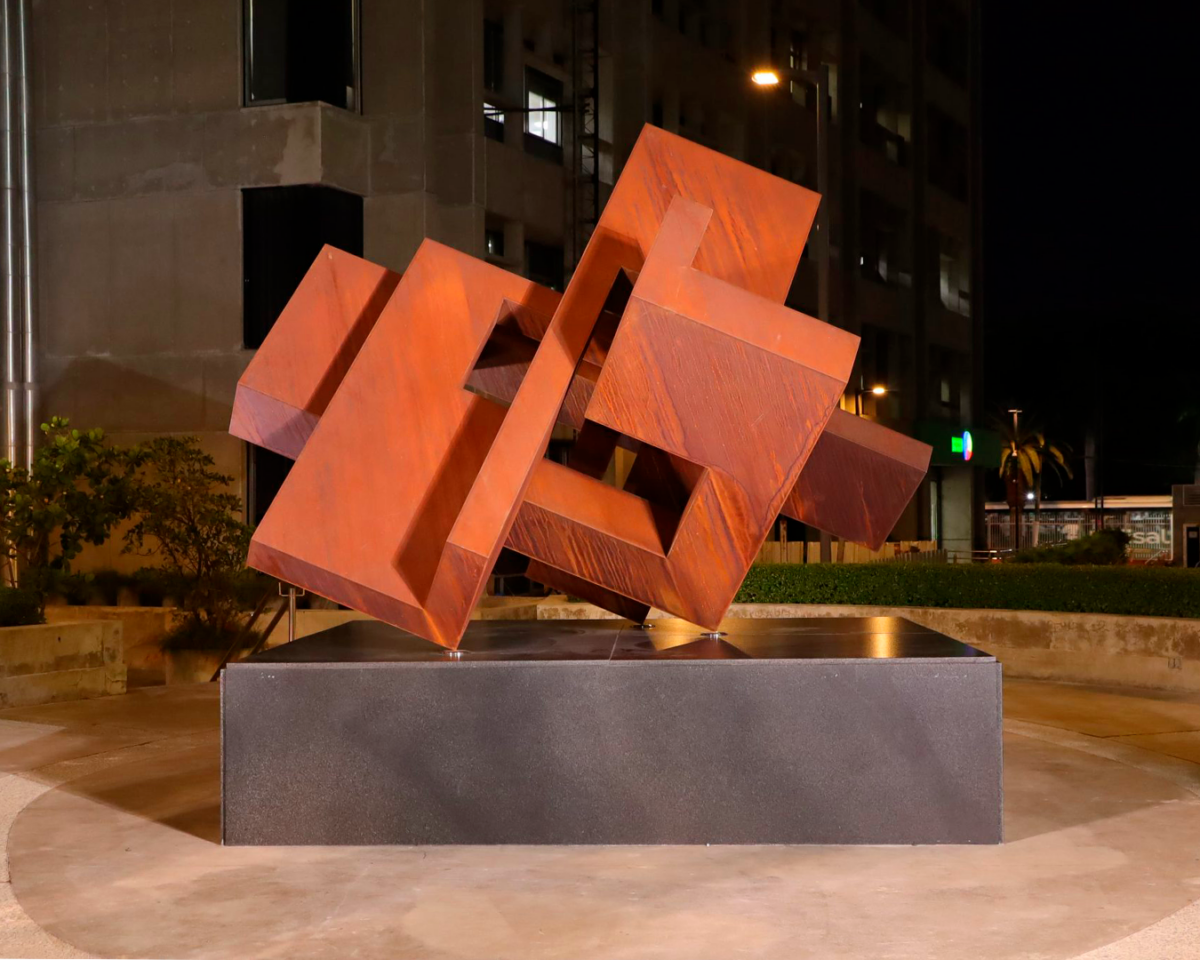 La obra de casi dos metros y medio de altura, está producida en acero cortén oxidado, que dota a la escultura de una estética industrial y contemporánea, permitiendo que evolucione con el tiempo, así como lo hacen las personas.
