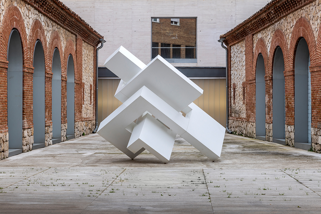 En el patio de acceso al museo, una escultura de blanco inmaculado, «MECANO», emula la obra de Sobrino “Relaciones” que recibe al viajero a la entrada de la ciudad.